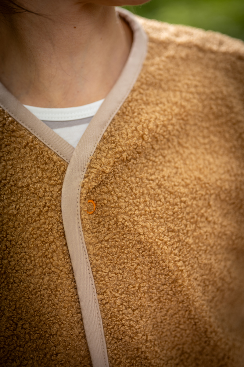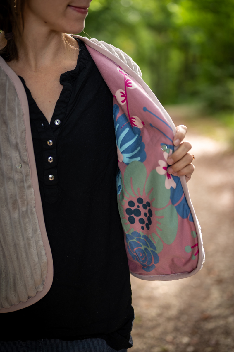Die erste Weste aus Boucle war mir etwas zu weit, so dass ich hinten eine Kellerfalte an den Saum genäht habe. Innen befindet sich ein cooler Birnenstoff, der ebenfalls gut zum Herbst passt. Alle Außenkanten habe ich mit einem Stoffstreifen aus Baumwolljersey versehen, so dass alles sauber gearbeitet ist.