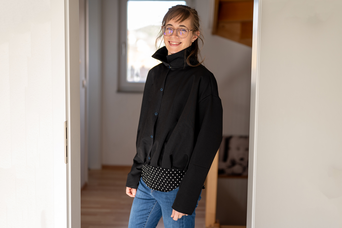 Ich habe mich, weil ich keinen passenden schwarzen Reißverschluss hatte, für eine einfache Knopfleiste mit Druckknöpfen entschieden. Bei der Stoffauswahl fiel meine Entscheidung auf einen Punta di Roma in schwarz, weil er dank seiner Griffigkeit für einen schönen Stand der Jacke sorgt. Außerdem liegt er echt schon so lange in meinem Fundus, dass ich nicht mehr weiß, woher ich ihn habe. Also hat er nun endlich seinen Einsatz bekommen.